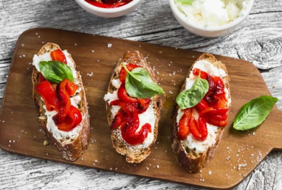 Brot mit gerösteten roten Paprikaschoten und Fetakäse